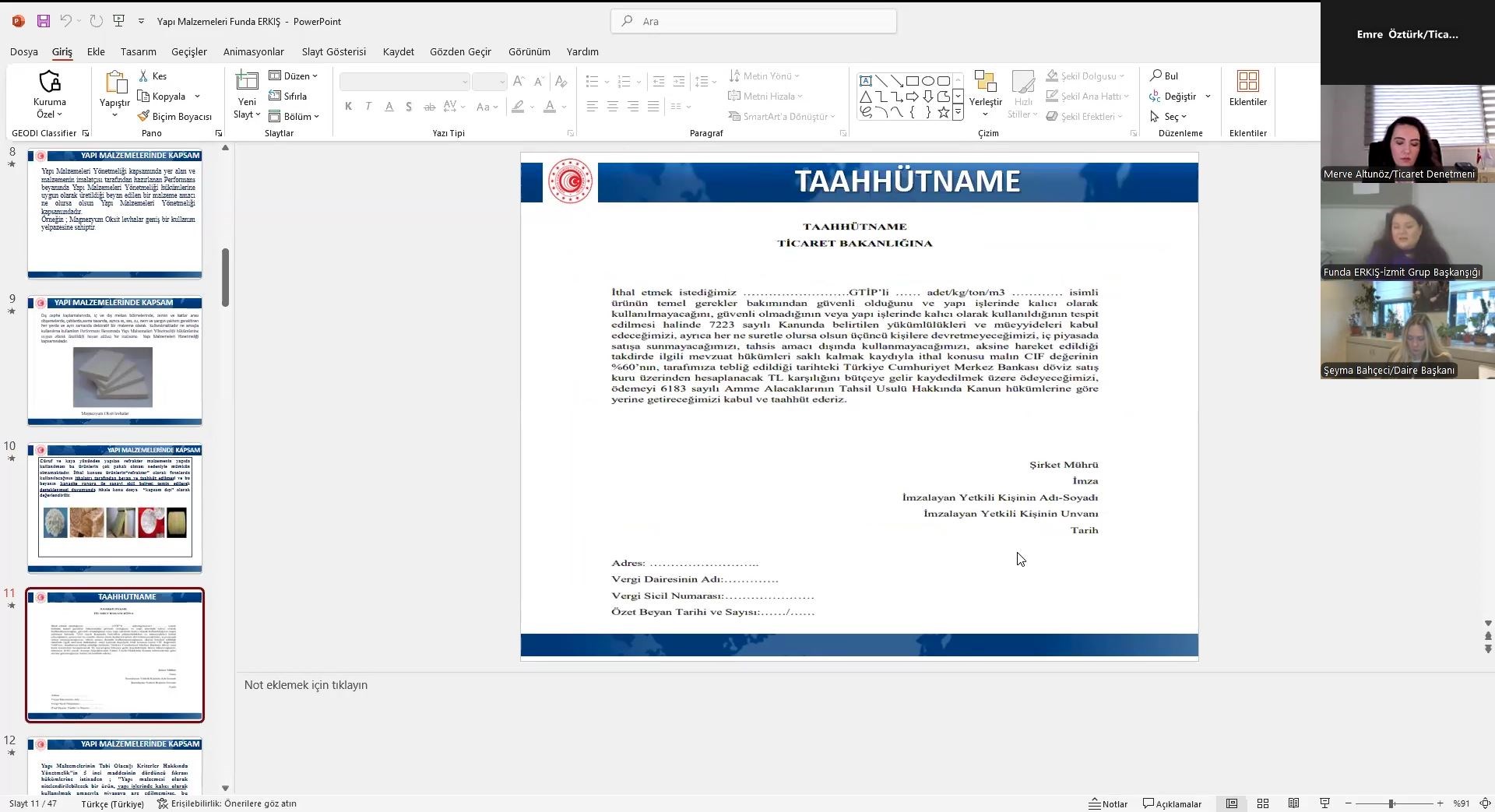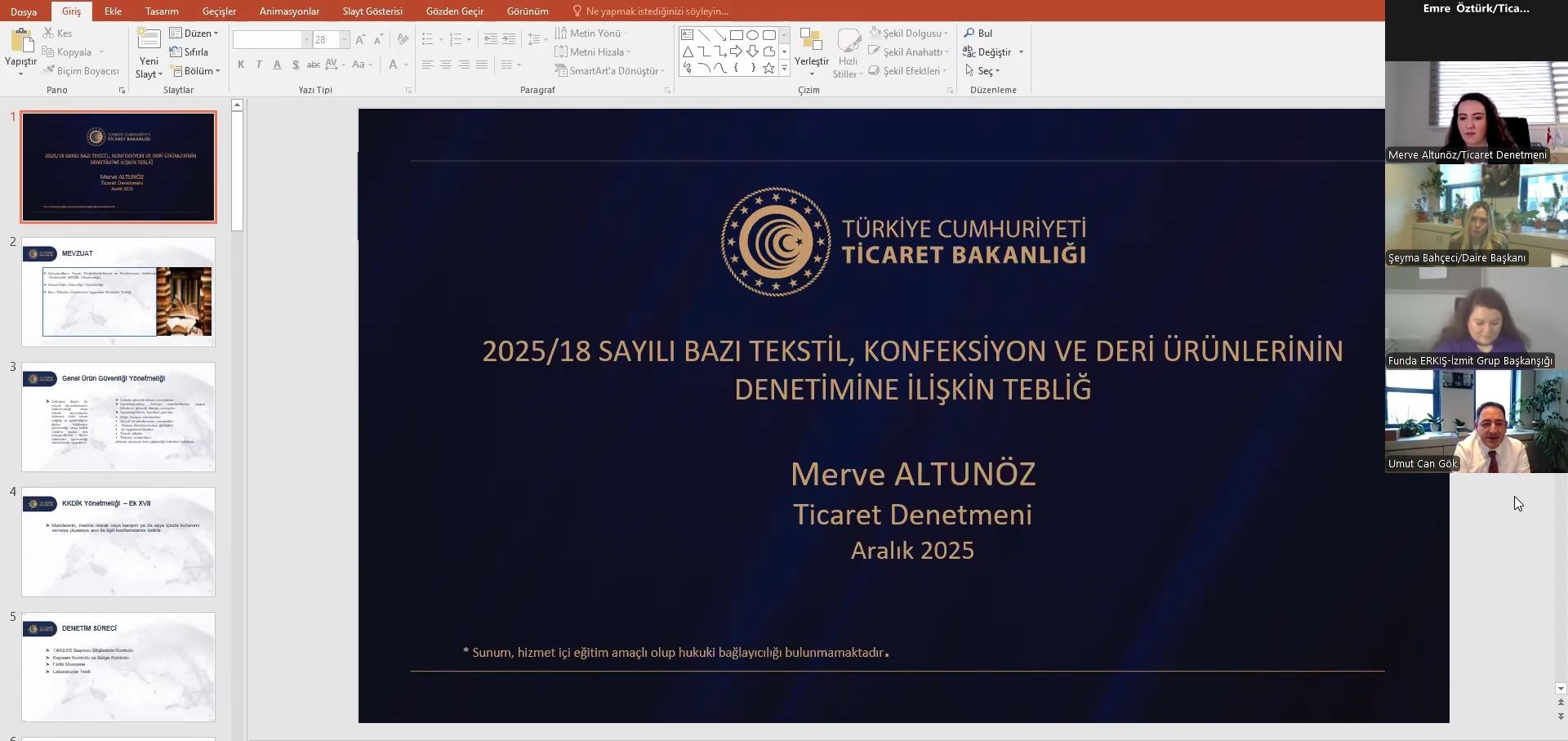 Anılan programlara, Yapı Malzemelerinin İthalat Denetimi Tebliği (Ürün Güvenliği ve Denetimi: 2025/14) ve Bazı Tekstil, Konfeksiyon ve Deri Ürünlerinin Denetimine İlişkin Tebliğ (Ürün Güvenliği ve Denetimi: 2025/18) hakkında düzenlenen çevrim içi eğitim programı ile devam edildi. Söz konusu eğitim kapsamında, İzmit Ürün Güvenliği Denetimleri Grup Başkanlığı’nda görevli Ticaret Denetmeni Funda ERKIŞ ve İstanbul Anadolu Yakası Ürün Güvenliği Denetimleri Grup Başkanlığı’nda görevli Ticaret Denetmeni Merve ALTUNÖZ tarafından sunumlar yapıldı. Gerek teorik bilgilerin gerek uygulamalı örneklerin verildiği sunumun ardından katılımcılardan gelen sorular, Sayın ERKIŞ, Sayın ALTUNÖZ ve Ürün Güvenliği ve Denetimi Genel Müdürlüğü personeli tarafından yanıtlandı.